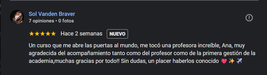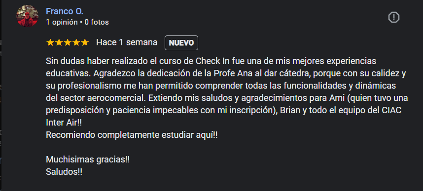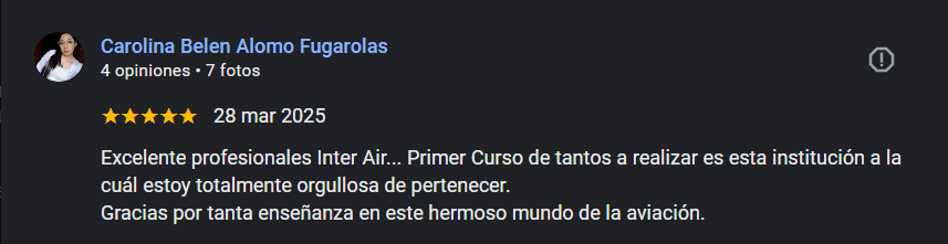 Quiero transmitir mi profundo agradecimiento tanto a la profesora Mabel del curso de Inglés Técnico Aeronáutico como a todo el excelente equipo que conforma InterAir por brindarme cada día las herramientas necesarias y tan valiosas como las clases, el material de estudio, los vídeos educativos, el trabajo diario con cada uno de nosotros, las prácticas de vestimenta, su dedicación, el incentivo y muchísimo más, es muy enriquecedor. Realmente lo recomiendo no sólo por el aspecto humano y profesional sino por su manera de prepararnos para desenvolvernos en este apasionante mundo de la aeronáutica. En mi experiencia personal, sin ser TCP hoy me siento capacitada para enfrentar una entrevista en inglés, manejando el idioma aeronáutico y hasta hacer los anuncios como si estuviera volando para una aerolínea. Fue un placer comenzar a abrir mis alas en InterAir y continuaré formándome con esta gran familia. Simplemente gracias de corazón ❤️. Montaini, Patricia Susana