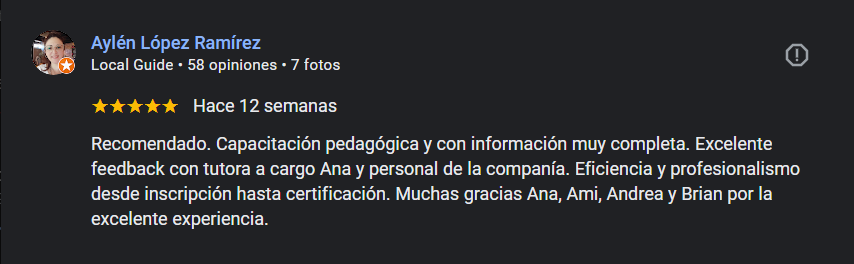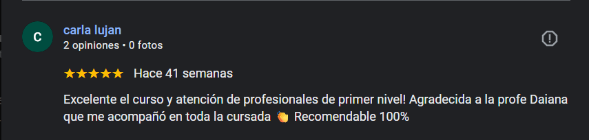 Una vez finalizado el curso, uno sale con una linda experiencia, cargado de conocimientos y con una idea muy clara de lo que estudió. Material muy completo. Sumamente agradecida.