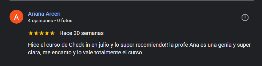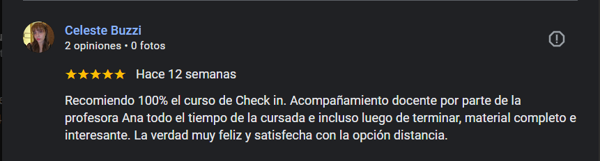 Me gustó mucho realizar el curso de Check-in. El profesor contesta siempre y se preocupa por los alumnos. Los chicos que me asesoraron para hacer el curso son lo más, me sacaron absolutamente todas las dudas que tenía y me encantó poder realizar el curso on-line.