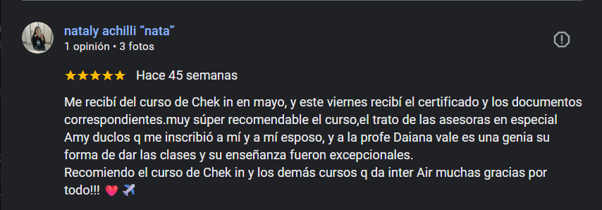 Haber cursado Auxiliar de Aeropuerto, Ventas y Carga (Check-in) en InterAir fue una excelente experiencia.